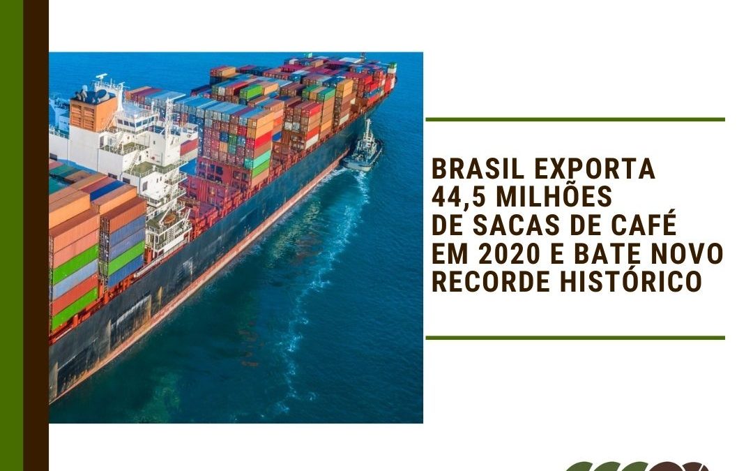 Em 2020, o Brasil exportou 44,5 milhões de sacas de café, considerando a soma de café verde, solúvel e torrado & moído, segundo relatório consolidado pelo Conselho dos Exportadores de Café do Brasil (Cecafé). O dado confere ao país um novo recorde histórico das exportações do produto para o ano e representa um crescimento de 9,4% em relação ao volume total exportado em 2019.