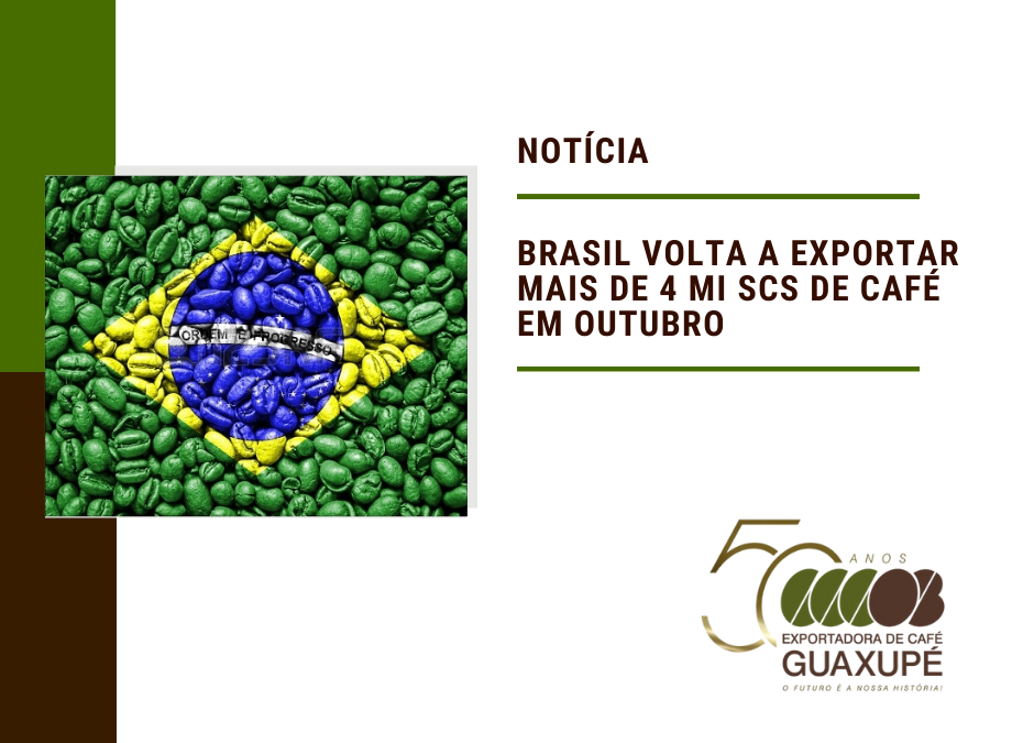 No acumulado dos quatro primeiros meses do ano safra 2020/21 (julho a outubro de 2020), o Brasil embarcou 15 milhões de sacas de café, aumento de 8,1% em relação ao mesmo período da safra anterior.