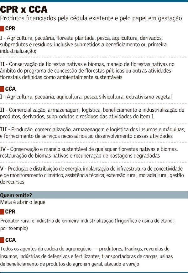 Esse é o objetivo do Ministério da Agricultura com a nova Cédula de Crédito do Agronegócio (CCA), cuja criação está em discussão embalada por cálculos que indicam potencial para alavancar algumas centenas de bilhões de dólares em todos os elos da cadeia.