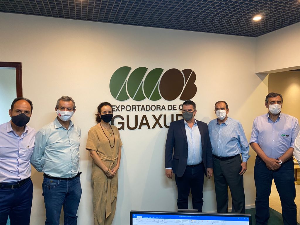 Cel. Guedes, Assessor Especial do Governo de Minas Gerais e Enlace com o Governo Federal. Antonio Carlos Arantes, Deputado Estadual MG. Flavia Barbosa, Diretora Executiva da Exportadora de Café Guaxupé Paulo Brant, Vice-Governador do Estado de MG Dr. Heber Quintella, Prefeito de Guaxupé. Cairo L. Cardoso, Diretor Financeiro da Exportadora de Café Guaxupé